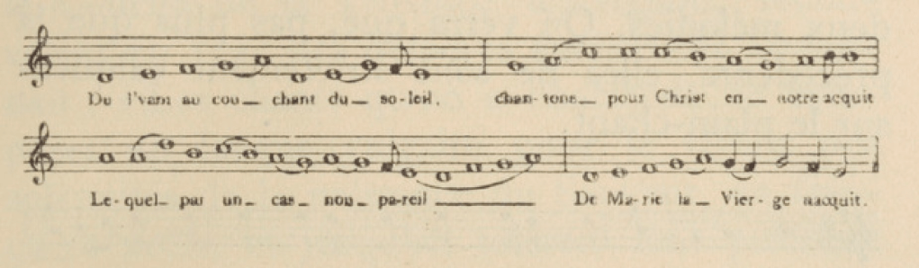 Si à l’origine des noëls on a les tropes, les hymnes, les séquences et les noëls farcis du Moyen-Âge, les mélodies proviennent aussi de la sphère profane. Il faut à ce sujet souligner que, contrairement à notre époque, la frontière entre le profane et le sacré était quasi inexistante au Moyen-Âge. Ainsi, il n’est pas rare qu’un chant profane s’inspire d’une mélodie sacrée ou que des paroles religieuses soient placées sous une mélodie profane (c’est le cas de nombreux cantiques). Le noël populaire n’échappe pas à cette règle du XIIème au XIXème siècle. Ce phénomène d’absorption d’un air profane dans la sphère religieuse date au moins du XIIème siècle (c’est peut-être plus ancien encore). Certains tropes adoptent des clausules de mélodies populaires. Néanmoins, il est important de préciser qu’au Moyen-Âge, la sphère liturgique reste elle, imperméable aux airs profanes et à son univers musical bien séparé de l’univers musical profane jusqu’au XIVème siècle inclus. Un basculement se produira au XVème siècle, avec l’utilisation de cantus firmus23 d’origine profane. L’exemple le plus célèbre est la fameuse “messe parodie” de Guillaume Dufay dite “messe de l’homme armé”.