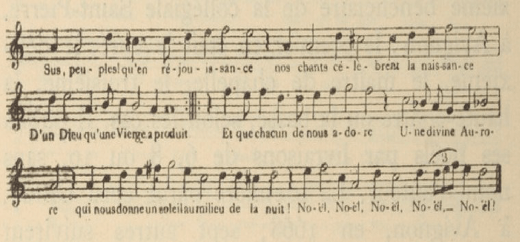 Écoutons encore Monique Rollin nous parler des mélodies des noëls : « Les mélodies empruntées sont anonymes et il n’est pas fait appel à un compositeur pour la musique de ces chants religieux. C’est l’auteur des paroles nouvelles qui procède au choix de la mélodie et à son adaptation. Les airs choisis ressortissent au genre du vaudeville, apparu vers 1550, qui recouvre uniquement des airs répandus dans le public. Ce sont des chansons en forme d’air, syllabiques, homophones et strophiques dans lesquelles tous les couplets se chantent sur une même musique »25.