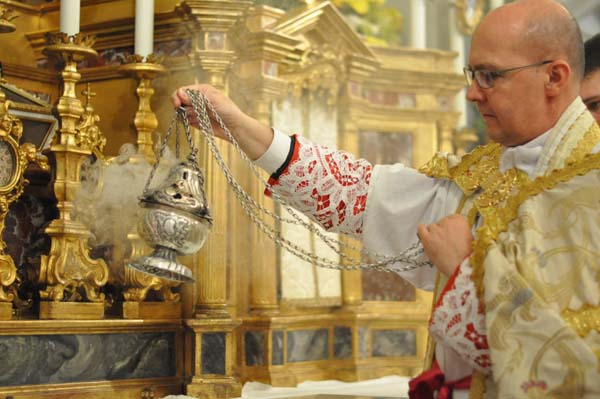 L’officiant encense la croix, (et les reliquaires s’il y en a) puis l’autel, et rend l’encensoir au cérémoniaire (qui le tend au thuriféraire) et retourne à la banquette. Le cérémoniaire l’accompagne, puis appelle le thuriféraire qui attendait au bas des marches. Le cérémoniaire encense l’officiant de trois coups doubles, puis rend l’encensoir au thuriféraire, qui va encenser le chœur (du plus digne au plus humble, en terminant toujours par le cérémoniaire et les acolytes), puis les fidèles. S’il y a un salut du Saint Sacrement après les vêpres, on installe l’autel en conséquence. On y place alors l’ostensoir, la clé du tabernacle et les rampes de cierges allumés, ainsi que le tabor si c’est l’usage.