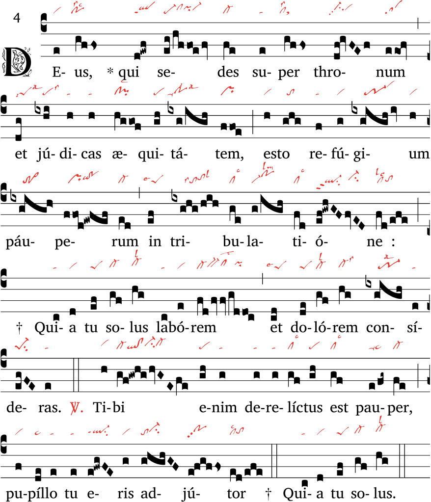 La première phrase, Deus qui sedes super thronum, brode autour de la finale mi du quatrième mode et s’apparente à une récitation un peu ornée. La mélodie prend un tour tout différent à et judicas æquitatem : elle s’élève du ré au si bémol, à la manière dont le font les incipits de beaucoup de pièces en premier mode ; la quarte ascendante du et évoque une trompette, et la montée vers une récitation sur la appelle une augmentation naturelle du volume de la voix qui accompagne l’idée de juste jugement que le narrateur appelle contre ses ennemis plus qu’il ne le redoute pour lui-même. Dans la phrase suivante, on peut noter le lent mouvement mélodique sur le O de tribulatione, qui donne à la phrase une expression suppliante ; mais c’est surtout dans le laborem et dolorem de la dernière phrase du refrain que cette expression suppliante est portée à son plus haut degré. Le mot laborem se conclut par une série de notes graves, allongées, pesantes ; la mélodie s’élève sur dolorem comme un cri déchirant, marqué lui aussi par une longue série de notes allongées.