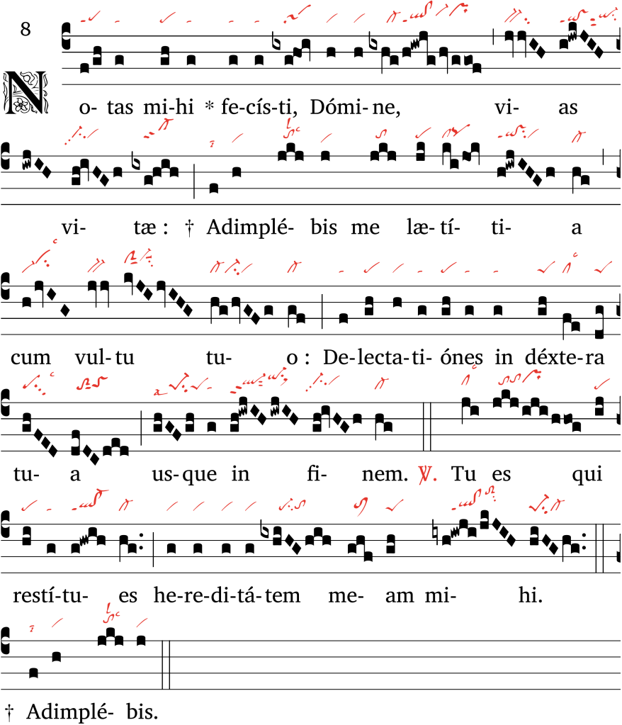 La première phrase, Notas mihi fecisti Domine, brode autour de la finale sol du huitième mode avant de s’élever sur Domine, avec un si bémol qui vient assez naturellement, mais va servir à produire un fort contraste avec le si bécarre du vias vitae qui suit. La mélodie de vias vitae est une cadence d’usage très fréquent et donc peu significatif, mais le contraste apporté par le si bécarre lui apporte une brillance et une vivacité qui correspond étroitement au texte. Adimplebis me lætitia brode autour du do supérieur, teneur du huitième mode, et constitue le sommet de la pièce ; cum vultu tuo est lui aussi une formule mélodique assez fréquente, mais elle est presque entièrement ralentie par les nombreux épisèmes, ce qui est inhabituel, et invite l’auditeur (et le chantre) à prendre le temps de savourer la mention de la “face divine” ; la même chose peut être dite de dextera tua, surtout au sujet de sa cadence de fin inhabituellement allongée.