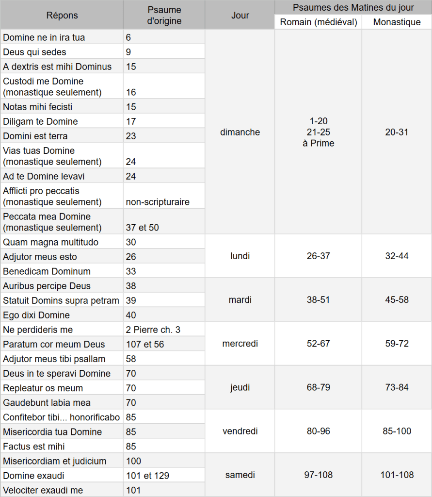 Les vingt-neuf répons de la série actuelle sont donnés dans le tableau ci-après. Cet arrangement est remarquable en ceci que, pour les autres temps liturgiques, les jours de la semaine reprennent les répons du dimanche qui précède, ce qui fait qu’une série de répons est intensivement utilisée (deux ou trois fois chacun) pendant une semaine, puis laissée de côté pour passer à une autre, en même temps qu’on passe à un nouveau livre de la Bible pour les lectures correspondantes. Ici, la même série est employée jusqu’à six semaines de suite, mais chaque répons n’est employé qu’une fois par semaine. On a donné dans le tableau le psaume dont est extrait chaque répons, ainsi que les psaumes chantés à Matines le même jour dans différents bréviaires. Les deux répons dominicaux utilisés dans le Bréviaire Romain de 1962 sont Domine ne in ira tua et A dextris est mihi. Les répons absents de la série romaine sont également signalés.