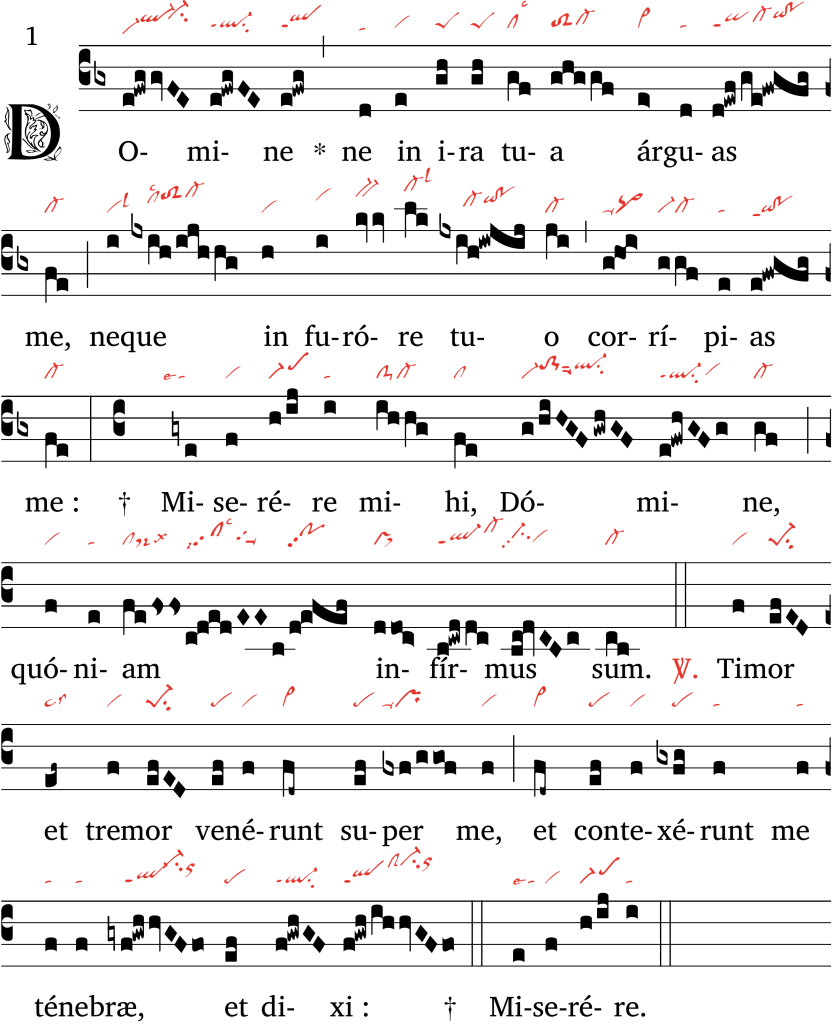 La première phrase, Domine, ne in ira tua arguas me, consiste en une série d’allers-retours entre le sol et le si bémol, dans un premier mode transposé, le sol y tenant le rôle de finale (à la place du ré), et le si bémol, celui de corde intermédiaire. Ces allers-retours poussent parfois jusqu’au fa en bas (qui serait un do en premier mode non transposé) et au do en haut (sol en premier mode non transposé). Cette mélodie, contenue dans une quinte, plutôt grave, fait l’effet d’une demande prudente, presque craintive ; la phrase neque in furore tuo offre un saisissant contraste mélodique, avec une attaque sur ré, teneur du premier mode transposé, et une envolée jusqu’au sol supérieur sur furore, évocatrice de la colère divine.
